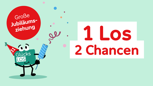 wir feiern 11 Jahre Glücks-Los mit unserer großen Jubiläumsziehung! Hier wandert dein Los gleich zweimal in den Topf. Also: Mach mit und sichere dir die doppelte Chance auf bis zu 2 Millionen Euro.1 Gleichzeitig unterstützt du viele soziale Projekte, die Menschen mit Behinderung, Kinder und Jugendliche stärken.